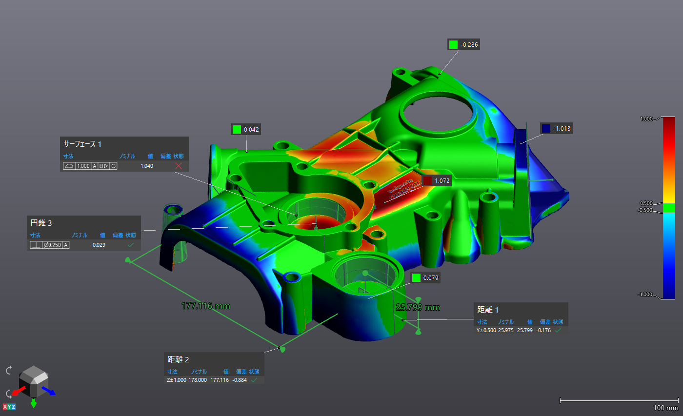 金型を修正したり成形条件を変更した際には、製品の変形や寸法を3Dデータと照合しながら評価します。3Dデータをカラーマップで表示することで、短時間での視覚的な確認が可能です。これにより、どの部分で変形や誤差が生じているか、また変形の起点がどこかを明確に把握でき、製品精度の向上に役立てることができます。