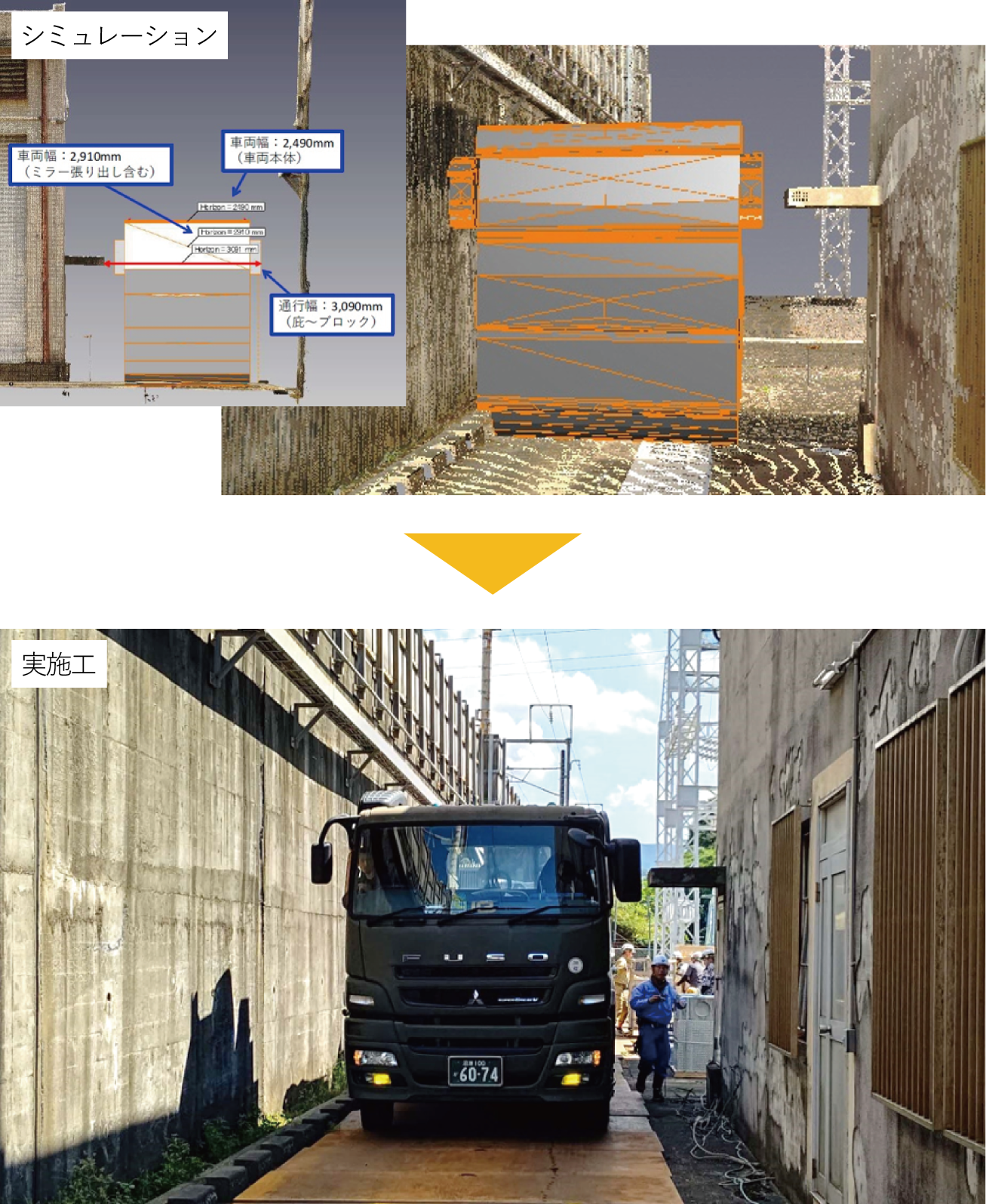 榊原氏は「大型車、クレーンや大きいトレーラーを現地に入れられるかシミュレーションをしたことがある。従来は多くの関係者を呼び、現地を見ながら打ち合せする。通路を通る時、図面上になかった庇(ひさし)や車止めのブロックがあり、運送会社さんには最初、これではトレーラーは通せないと言われた。しかし、点群データと運送会社さんからもらったトレーラーのCAD図をもとにシミュレーションしたら、通れることが分かった」と語った。
